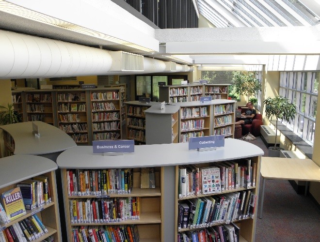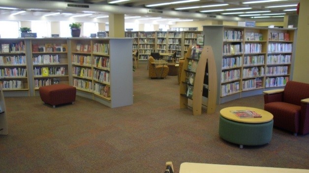 The library was excited to blend their space and furniture design ideas with its nonfiction neighborhood concept. Varying height bookcases in curving sweeps, with bold clear signage, invites readers to explore and discover information related to their needs and interests. Each propeller-shaped bookcase unit houses a neighborhood collection of related materials. Categories such as Parenting, Health and Wellness, A Better You, and Technology, to name a few, group together the nonfiction collection. Items are now located together for the convenience of the reader rather than in separate locations dictated by the Dewey Decimal order.