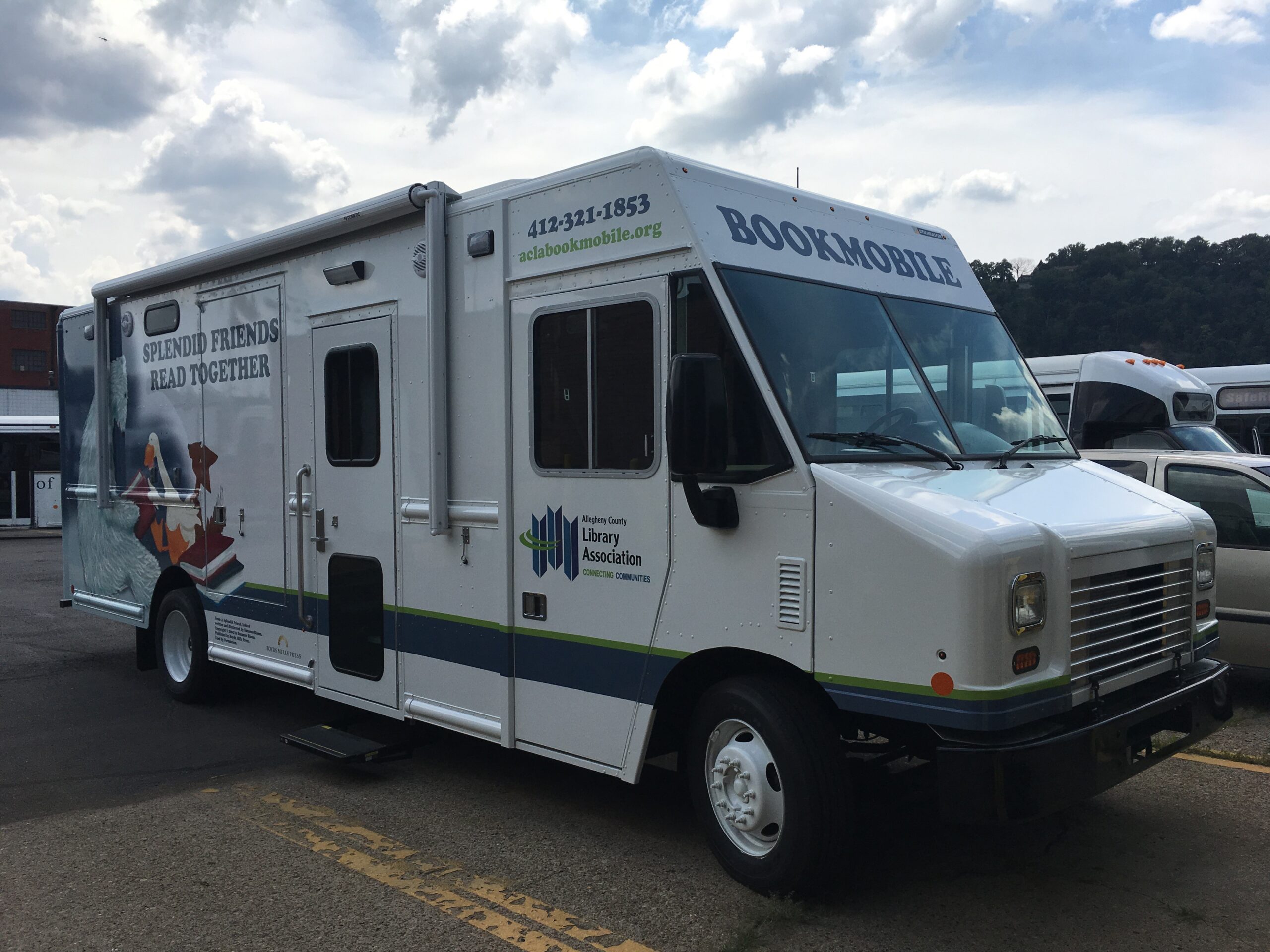 The preschool bookmobile was replaced in 2017 with another child friendly vehicle that allows for ease of access, front facing book display, and low seating. Children’s book author and illustrator Suzanne Bloom permitted the artwork from her Splendid Friends series to be used on the vehicle. Service has expanded from 9 to 12 months a year, and visits Head Starts and daycares throughout Allegheny County.