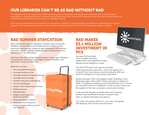 RAD MAKES $3.1 MILLION INVESTMENT IN PCSLast year, RAD provided much-needed computer replacements and upgrades at public libraries across Allegheny County. The $3,123,075 grant was used to purchase 2,464 new personal computers, which will replace outof-date PCs at every library currently funded by RAD and within the Allegheny County Library Association. Beyond the grant, RAD is the largest funder of libraries in the Pittsburgh region with a $40.3 million allocation to libraries in 2024. A competitive bidding process led eiNetwork, the IT service arm for public libraries in Allegheny County to select Lenovo as the supplier of the new computers, servers and monitors. In the past half-decade, as virtual work and schooling sessions have proliferated, library computers have taken on added importance for patrons. The order will include 1,643 all-in-one units, 515 laptops, 306 desktops, 262 monitors and 78 servers. RAD SUMMER STAYCATIONRAD unveiled the Summer Staycation program that will provide Allegheny County library card holders access to RAD-funded attractions that typically charge for daily admission. RAD Summer Staycation will also highlight additional free summertime events taking place at the RAD assets.Starting in May and running through August of each year, Allegheny County library card holders are eligible to book 100,000+ free admissions using their RAD Pass.Attractions include:%u2022 The Andy Warhol Museum%u2022 Carnegie Museum of Art%u2022 Carnegie Museum of Natural History%u2022 Carnegie Science Center%u2022 Children%u2019s Museum of Pittsburgh%u2022 The Frick Pittsburgh%u2022 Senator John Heinz History Center%u2022 Mattress Factory%u2022 National Aviary%u2022 Phipps Conservatory and Botanical Gardens%u2022 Pittsburgh Botanic Garden%u2022 Pittsburgh Zoo & Aquarium%u2022 Soldiers & Sailors Memorial Hall and MuseumOUR LIBRARIES CAN%u2019T BE AS RAD WITHOUT RAD The Allegheny Regional Asset District (RAD) provides grants to Allegheny County%u2019s libraries, parks and trails, arts and cultural organizations, regional attractions, sports and civic facilities, and public transit. RAD%u2019s revenue comes from half of the proceeds of an additional one percent sales and use tax in Allegheny County.ACLA and its member libraries are grateful for the support of RAD for its annual funding, but also for its contributions to specific programs that make a positive impact on the residents of Allegheny County. Here are two programs making a change.