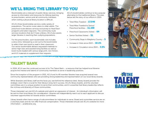 WE%u2019LL BRING THE LIBRARY TO YOUBookmobiles are a vital part of public library services, bringing access to information and resources for lifelong learning to preschoolers, seniors and all community members when visiting a physical library location is difficult. ACLA%u2019s three bookmobiles service a wide variety of populations. The senior route caters to older adults. The preschool route delivers services exclusively to Head Start programs and select daycares. The community route services locations that don%u2019t have a library. ACLA also assists larger libraries in reaching their outlying populations. For the preschoolers, each bookmobile visit includes a story-time, followed by a visit out to the bookmobile to select their own book to read in their classroom. Our senior bookmobile delivers requested materials to senior high rises and assisted living facilities as well as book trucks loaded with various large print, non-fiction, and A/V materials to supplement their requests. ACLA%u2019s bookmobiles continue to be a popular alternative to the traditional library. The stats below tell the story of our efforts in 2024.%u2022 Total Miles Traveled %u2013 17,546%u2022 Total Miles Traveled to Senior/Preschool facilities %u2013 11,168%u2022 Preschool Classrooms Visited %u2013 64%u2022 Senior Facilities Visited %u2013 51%u2022 Community Stops in Allegheny County %u2013 5%u2022 Increase in Visits since 2023 %u2013 10.1%%u2022 Increase in Circulation since 2024 %u2013 3.5%TALENT BANKIn 2024, ACLA saw the continued success of its The Talent Bank %u2013 a resource that has helped local libraries acquire the interest and talents of community members to serve in leadership positions.Since the inception of the program in 2021, ACLA and its 46 member libraries have acquired several new community representatives who are providing strong leadership and representation on our local library boards.While librarians and library staff are the faces you see behind the reference desk, library boards provide the strategic vision that is crucial for their library%u2019s long-term success. ACLA%u2019s library boards, and the volunteer committees are in a unique position to serve their communities, and it is essential that library leadership reflects the richness and diversity of those communities.Those interested can visit ACLA%u2019s website and submit an expression of interest. An individual%u2019s information will be sent to their local library for consideration. Libraries will independently reach out to each applicant to discuss volunteer opportunities for boards and/or committees.Library boards often have a range of subcommittees for individuals to serve. Board and committee service are on a voluntary basis and do not offer financial compensation. Those interested should visit ACLA%u2019s website for more information %u2013 aclalibraries.org.